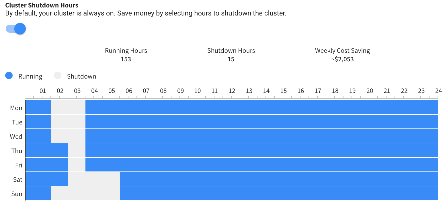 You can build a weekly schedule for the hours your cluster is up and running. You are charged only for the running hours.